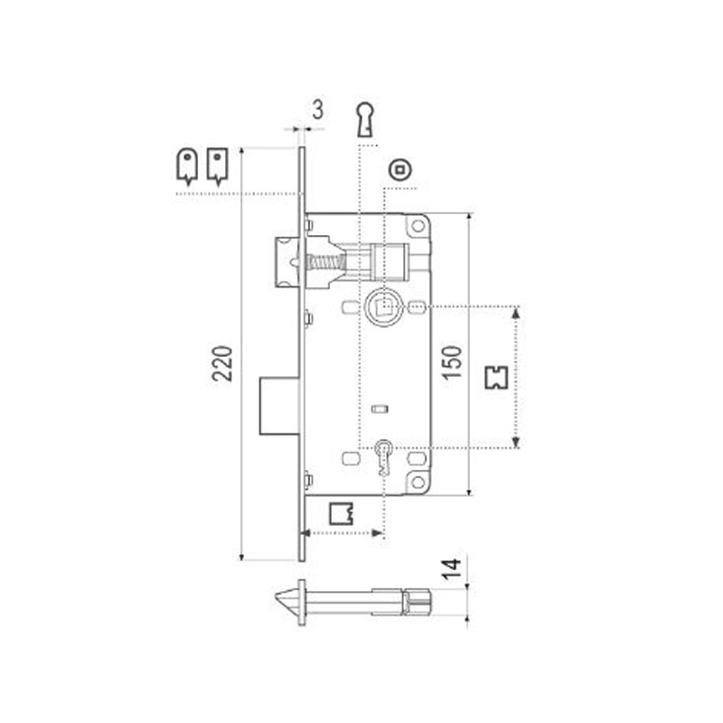 Κλειδαριά AGB μεσόπορτας 40 x 75 x 24 x 220 mm με κίτρινη τετράγωνη πλάκα.