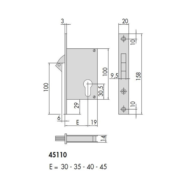 Κλειδαριά χωνευτή κυλίνδρου CISA με παπαγαλάκι για συρόμενες πόρτες με υποδοχή για κύλινδρο.