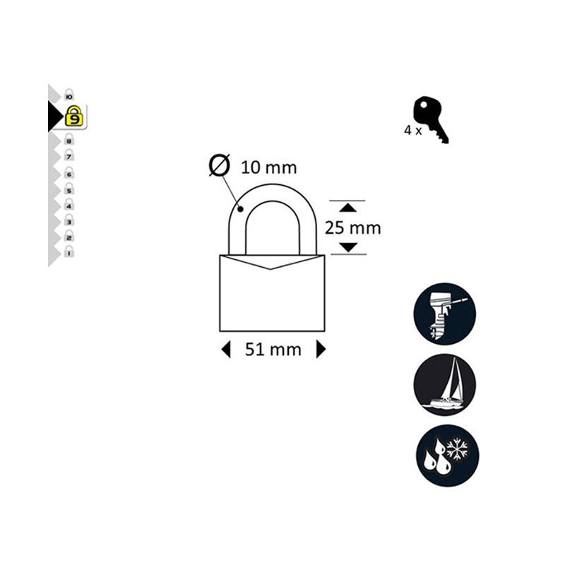 Ναυτιλιακό λουκέτο Excell 51mm λαμινέ ανοξείδωτο Boron, ιδανικό για σκάφη και για μέρη κοντά στη θάλασσα.