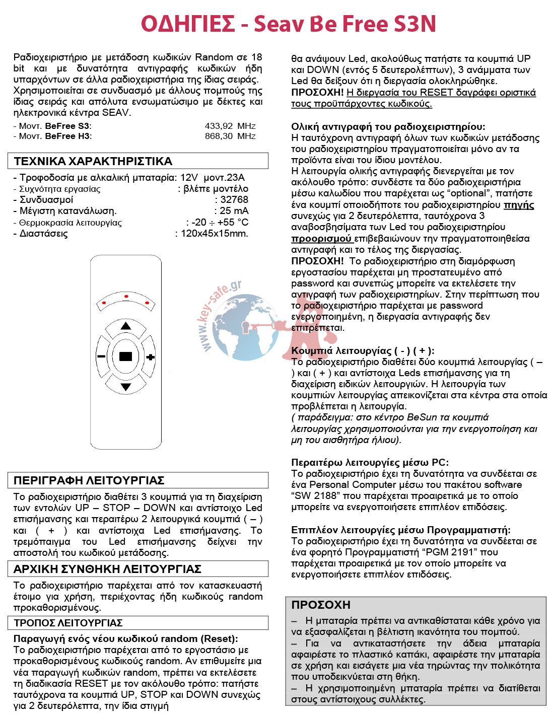 Τρικάναλο τηλεκοντρόλ Seav Be Free S3N για ρολλά, τέντες κτλ. Σε συχνότητα 433,92 ΜHz, 18 bit Random κωδικού.